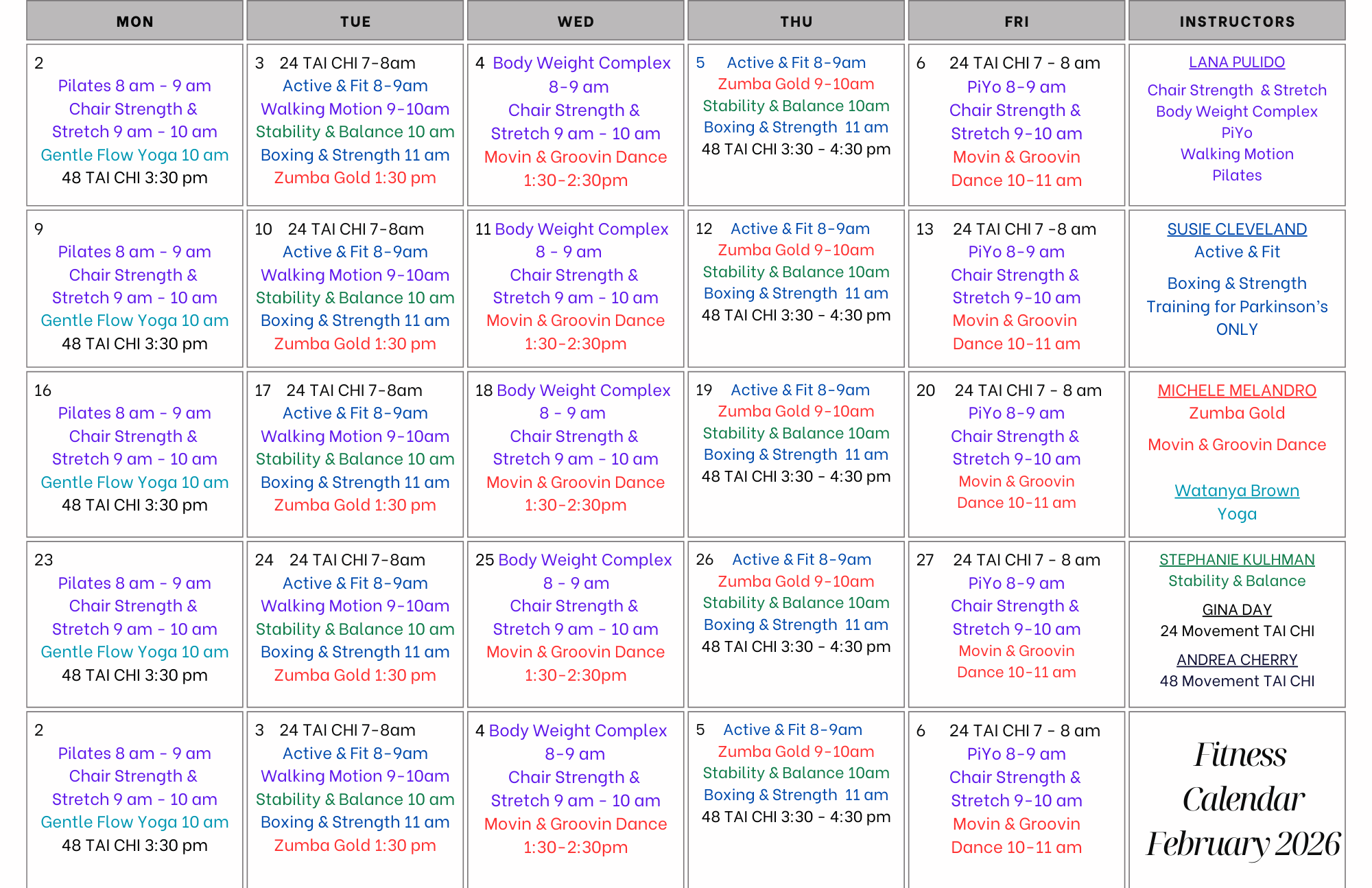 *NOTE: See our activities calendar and/or newsletter for monthly special events.