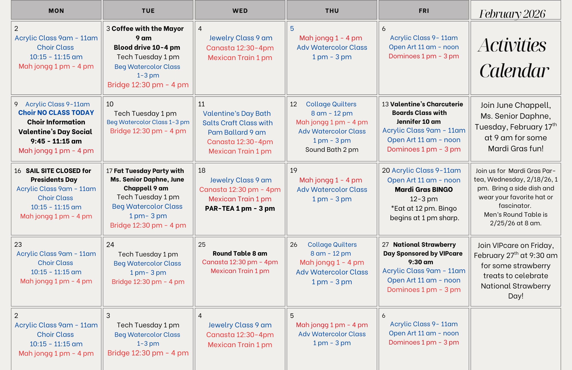 *NOTE: See our activities calendar and/or newsletter for monthly special events.